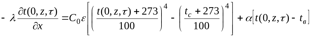 8) на зовнішній поверхні обмурівки відбувається теплообмін з навколишнім середовищем за законом Стефана-Больцмана і конвекцією за законом Ньютона.