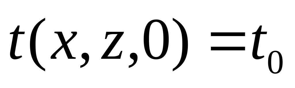 де t = t(x,z,) – температура; x – координата, направлена по товщині обмурівки; z – координата, направлена по висоті ділянки; – час; , с і – густина, теплоємність і теплопровідність матеріалу, що визначаються як