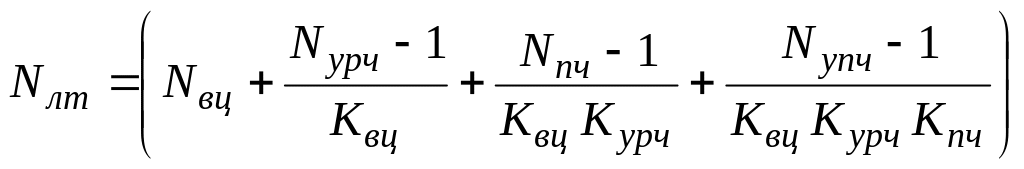 Коэффициент шума линейного тракта, состоящего из ВЦ, одного каскада УРЧ, преобразователя частоты и УПЧ, определяется по формуле: