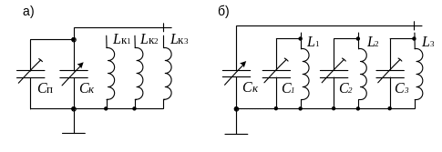 На уровне принципиальных схем переход с одного поддиапазона на другой осуществляется скачкообразным изменением индуктивности контура Lк при помощи переключателя (рис. а). Также широко распространена схема переключения поддиапазонов подключением контуров (рис. б).