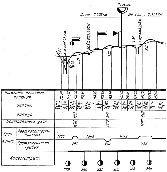 Сокращенный продольный профиль (рис. 4) в отличие от нормального имеет более мелкий горизонтальный (2 см = 1 км) и более крупный вертикальный (2 мм = 1 м) масштаб. На нем наносят проектный продольный профиль земляного полотна и план линии, километраж, оси раздельных пунктов и расстояния между ними, входные и проходные сигналы, входные стрелочные переводы с указанием расстояния до них от оси остановочных пунктов, путевые здания, переезды, искусственные сооружения.
