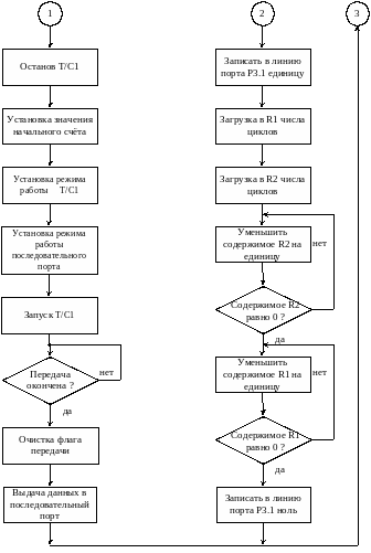 Составим блок-схему алгоритма передачи данных через последовательный порт. Первым делом необходимо остановить Т/С1, после чего загрузить в регистр TH1 число, определяющее скорость передачи через последовательный порт. Далее необходимо в регистрах SCON и TMOD установить режимы работы последовательного порта и Т/С1 соответственно. После всех установок производится запуск Т/С1 на счет и запускается цикл ожидания окончания передачи. Если передача окончена выполняется очистка флага передачи T1. После чего происходит выдача 9 бит данных в последовательный порт.