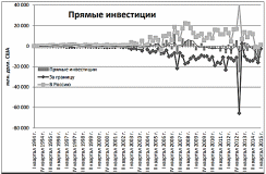 График показывает, что рост инвестиций за рубеж не приносит повышения доходов, то есть инвестиции за рубеж производятся по низким ставкам доходности. Обратные же инвестиции (в Россию) идут по высоким ставкам, вследствие чего, несмотря на общую динамику вывоза капитала, доходы на этот капитал не возвращаются. Разница между доходами на вывезенный капитал (к получению) и доходами на ввезенный капитал (к выплате) растет. Таким образом, идет как бегство капитала, так и бегство прибыли.