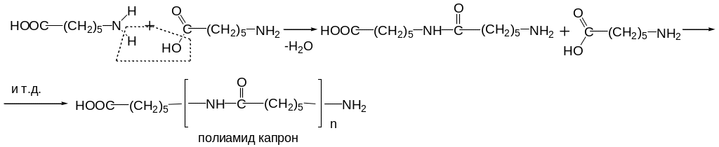 Поликонденсация – это такой процесс образования молекулы полимера, при котором в ходе реакции выделяются низкомолекулярные продукты (H2O, NH3, HCl и т.п.). Примером такой реакции может служить получение капрона: