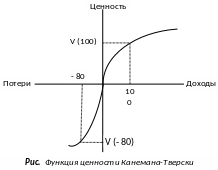 Канеманом и Тверски выявлено, что люди в условиях неопределенности оценивают альтернативы не по функции полезности, а по функции ценности, которая определяет предпочтения индивида, исходя из отклонений от его исходного богатства (необязательно выраженного в деньгах).