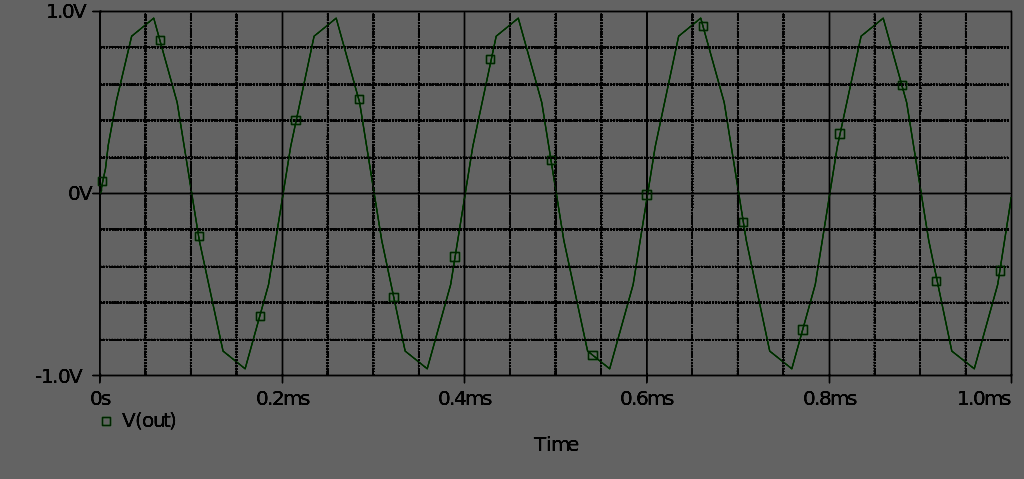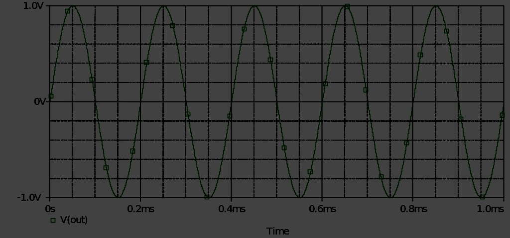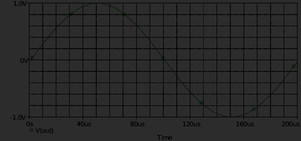 Пример 1: для схемы, приведенной на рис.14 построить отклик на синусоидальный сигнал частотой 5кГц, амплитудой 1 В. В окне временного анализа установим Final Time равное 1 периоду входного сигнала T=1/5000 = 0.0002s = 0.2ms. Окно временного анализа показано на рис.15, результат моделирования на рис.16.