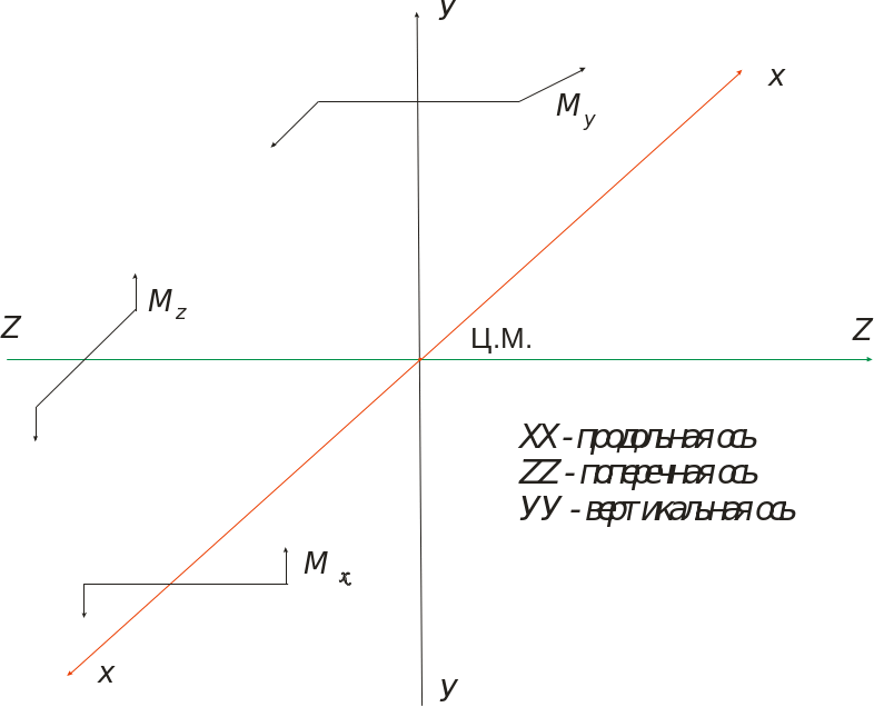 При анализе балансировки, устойчивости и управляемости самолета пользуются системой координат. За начало системы координат принят центр тяжести (Ц.М) самолета. Вращение относительно Ц.Т. может быть вызвано лишь внешними силами.