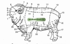 1-тұмсығы; 2- маңдайы; 3- көзі; 4 көз ойығы; 5-құлағы; 6- мүйізі; 7- желкесі; 8-мойыны; 9-шоқтығы; 10- жотасы; 11- белі; 12- құйымшағы; 13- құйрығы; 14- бұғанасы; 15-қабырғасы; 16-саны; 17-құрсағы; 18- алдыңғы аяқтары; 19-артқы аяқтары; 20- дорбасы; 21-білек сүйегі; 22-серіппелі буын; 23-өкпе сүйегі; 24-табан сүйегі; 25-тұяқтары.