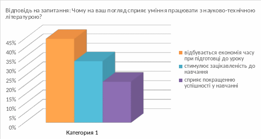 Відповідаючи на запитання анкети: «Чому на ваш погляд сприяє уміння працювати з науково-технічною літературою?», 45% учнів вважають, що відбувається економія часу при підготовці до уроку; 33% вважають, що це стимулює зацікавленість до навчання; 22% вважають, що це сприяє покращенню успішності у навчанні (Рис. 2.3).