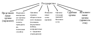 Этими признаками государство отличается от племенного строя, при котором есть вожди, но отсутствуют особые органы власти, и что важно, имеет место всеобщее вооружение народа. Структура государства и его составные части изображены на следующей схеме.