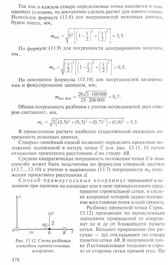 Основными погрешностями при построении каждого из створов являются погрешности положения исходных точек, погрешности центрирования теодолита и визирных целей, погрешность визирования и перемены фокусировки зрительной трубы при наведении на визирную цель и на определяемую точку, т.е.