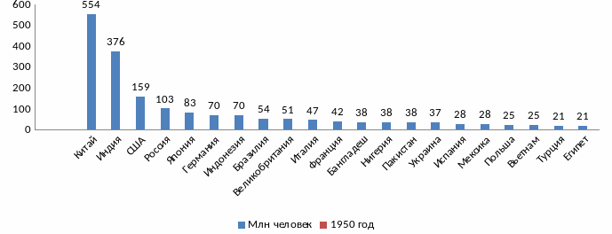 Среди крупнейших стран мира, в которых сосредоточено 75% населения мира, Россия опустилась на 9 место по данным ООН (1 июля 2017 года). Хотя в 1950 году занимала 4 место и уступала лишь Китаю, Индии и США (Приложение №2)1. Проанализировав данные, можно сделать вывод, что Россия теряет свое положение среди мировых лидеров по численности населения.(См. рис. 1,2)