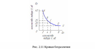 Кривая безразличия (U) представляет собой совокупность потребительских наборов, каждый из которых имеет одинаковую полезность для потребителя.