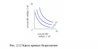 Описать предпочтения по всем наборам разных товаров (X и Y) можно с помощью карты кривых безразличия (рис. 2.12). Карта кривых безразличия – это множество кривых безразличия, каждая из которых представляет собой различный уровень полезности. Чем кривая безразличия дальше от координат, тем выше полезность набора товаров.