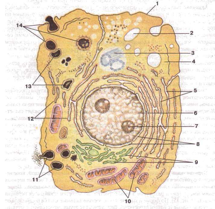 Клетка представляет собой структурную и функциональную единицу многоклеточного организма. Клетки различны по форме, размерам и функциям. В состав клетки входят следующие структурные компоненты. Ядро – управляет синтезом белка и процессами жизнедеятельности клетки. Ядро окружено кариолеммой, содержит одно или несколько ядрышек, хромосомы и кариоплазму. Аппарат Гольджи - участвует в формировании некоторых продуктов жизнедеятельности, синтезе гликопротеидов. Митохондрии – "силовые станции клетки". На внутренней мембране митохондрий происходит синтез АТФ. Эндоплазматическая сеть – представляет собой сеть развитых канальцев. Различают гладкую и гранулярную ЭПС. На гладкой ЭПС идет синтез липидов и углеводов. На гранулярной ЭПС – синтез белка. Рибосомы – участвуют в синтезе белка. Лизосомы (включения клетки) – принимают участие в утилизации чужеродных частиц и отмерших частей клетки. Снаружи клетка покрыта мембраной, которая выполняет функции защиты, обмена веществ, обладает избирательной проницаемостью. Внутреннее пространство клетки заполнено цитоплазмой.