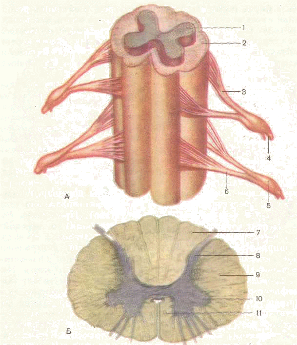 Белое вещество спинного мозга состоит из проводящих путей, образованных длинными отростками нейронов.