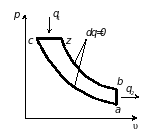Для проведения термодинамического анализа эффективности работы циклов можно считать, что в этих процессах к рабочему телу подводится теплота q1, поэтому зачастую эти термодинамические циклы называют соответственно: с изохорным подводом теплоты, с изобарным подводом теплоты, со смешанным подводом теплоты. Во всех указанных циклах отвод теплоты q2 осуществляется по изохоре ba, рисунок 1.