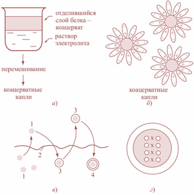 Опарин предполагал, что решающая роль в превращении неживого в живое принадлежала белкам. Благодаря амфотерности белковых молекул они способны к образованию коллоидных гидрофильных комплексов – притягивают к себе молекулы воды, создающие вокруг них оболочку. Эти комплексы могут обособляться от всей массы воды, в которой они суспендированы (водной фазы), и образовывать своего рода эмульсию. Слияние таких комплексов друг с другом приводит к отделению коллоидов от водной среды – процесс, называемый коацервацией (от лат. Coacervus – сгусток или куча). Богатые коллоидами коацерваты, возможно, были способны обмениваться с окружающей средой веществами и избирательно накапливать различные соединения, в особенности кристаллоиды. Коллоидный состав данного коацервата, очевидно, зависел от состава среды. Разнообразие состава «бульона» в разных местах вело к различиям в химическом составе коацерватов и поставляло таким образом сырьё для «биохимического естественного отбора».