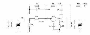 Особенностью схемы является включения в цепь коллектора входного каскада резонансного колебательного контура LC, настроенного на частоту колебаний входного сигнала за счет резонансных свойств колебательного контура. Входной сигнал усиливается в десятки раз (коэффициент усилителя во многом определяется добротностью колебательного контура LC).