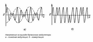 В балансном модуляторе можно осуществить либо режим линейной модуляции, либо режим коммутации (переключений). На рис. 2.9.4 показаны временные диаграммы напряжений на выходе модулятора для этих режимов.