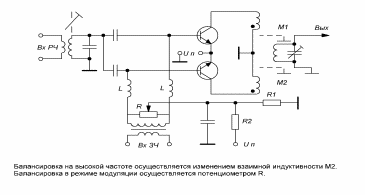 На вход индуктора (вх.PЧ) подаётся сигнал несущей частоты , который через индуктивную связь поступает во входной колебательный контур, настроенный на эту частоту. Далее через разделительные конденсаторы сигнал высокочастотной несущей прикладывается к базам транзисторов модулятора.