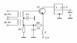 Рис 2.9.2. Принципиальная схема амплитудного модулятора с модуляцией в цепи эмиттера.