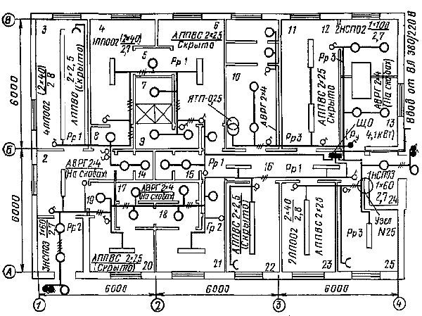 Монтажная схема (рис. 6) – это чертеж, на котором предоставлена расположение элементов электропроводки относительно строительных конструкций, которые указываются не в масштабе, а при помощи условных, графических изображений, по которым определяют: