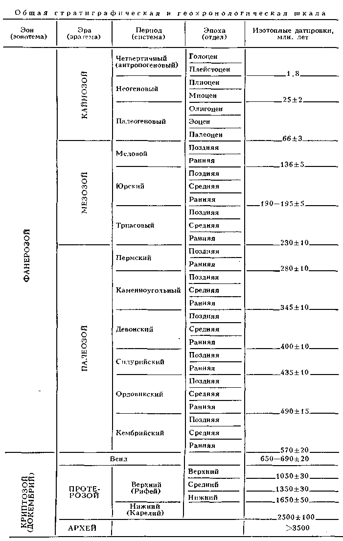 три эонотемы:архейскую,протерозойскуюфанерозойскую. Архейскую и протерозойскую эонотемы объединяют под названием «докембрий» (т. е. толщи пород, накопившиеся до кембрийского периода – первого периода фанерозоя) или «криптозой».Рубежом докембрия и фанерозоя служит появление в слоях горных пород остатков скелетных организмов.В докембрии органические остатки редки, поскольку мягкие ткани быстро разрушаются, не успев захорониться.