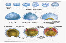 Рисунок 1. Дробление оплодотворенного яйца ланцетника и образование зародышевых листков.