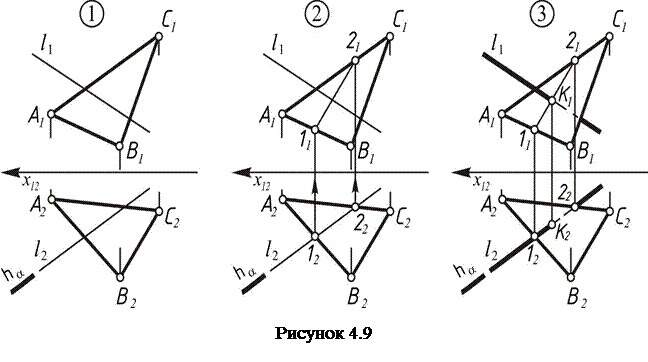 Точка принадлежит плоскости, если она расположена на прямой, принадлежащей данной плоскости. Для того чтобы построить в плоскости a(bÇc) точку K (рисунок 4.2), необходимо провести в плоскости прямую l, принадлежащую плоскости a(bÇc), а затем задать на ней точку K, которая принадлежит прямой l и, следовательно, плоскости a(bÇc).