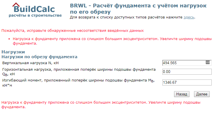 Сообщение, что «нагрузка к фундаменту приложена со слишком большим эксцентриситетом» свидетельствует о том, что основание перегружено, т.е. по задней грани подошвы фундамента действуют растягивающие напряжения, что не допустимо.
