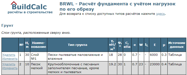 - •Пример программного расчета основания подпорной стенки по двум предельным состояниям с использованием сайта www.BuildCalc.Ru.