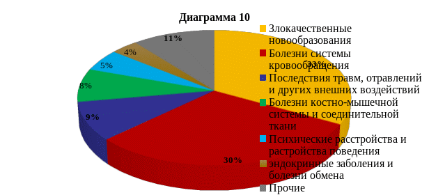 Вывод: среди заболеваний, приводящих к первичной инвалидности населения, преобладают злокачественные образования и болезни системы кровообращения (диагр.10). Это связано с массивными промышленными отходами и выбросами, с чрезвычайными ситуациями техногенного характера на нефтеперерабатывающих и химических предприятиях, связанные с авариями на магистралях нефте- и газопроводов (канцерогенный эффект и наибольшая тропность к органам системы кровообращения).