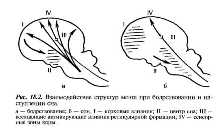 Всостоянии сна при уменьшении потока сенсорной информации снижаются восходящие активирующие влияния ретикулярной формации на кору мозга, в результате чего устраняются тормозные влияния лобной коры на нейроны центра сна заднего гипоталамуса. Эти нейроны в свою очередь начинают еще активнее тормозить ретикулярную формацию ствола мозга.