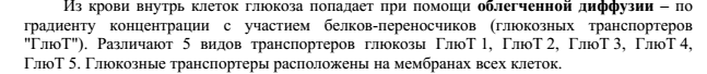 вторично-активный транспорт- перенос глюкозы параллельно переносу ионов Na+ в клетку с затратой энергии против градиента концентрации, при низкой концентрации углеводов в кишечнике, т.е. между приемами пищи