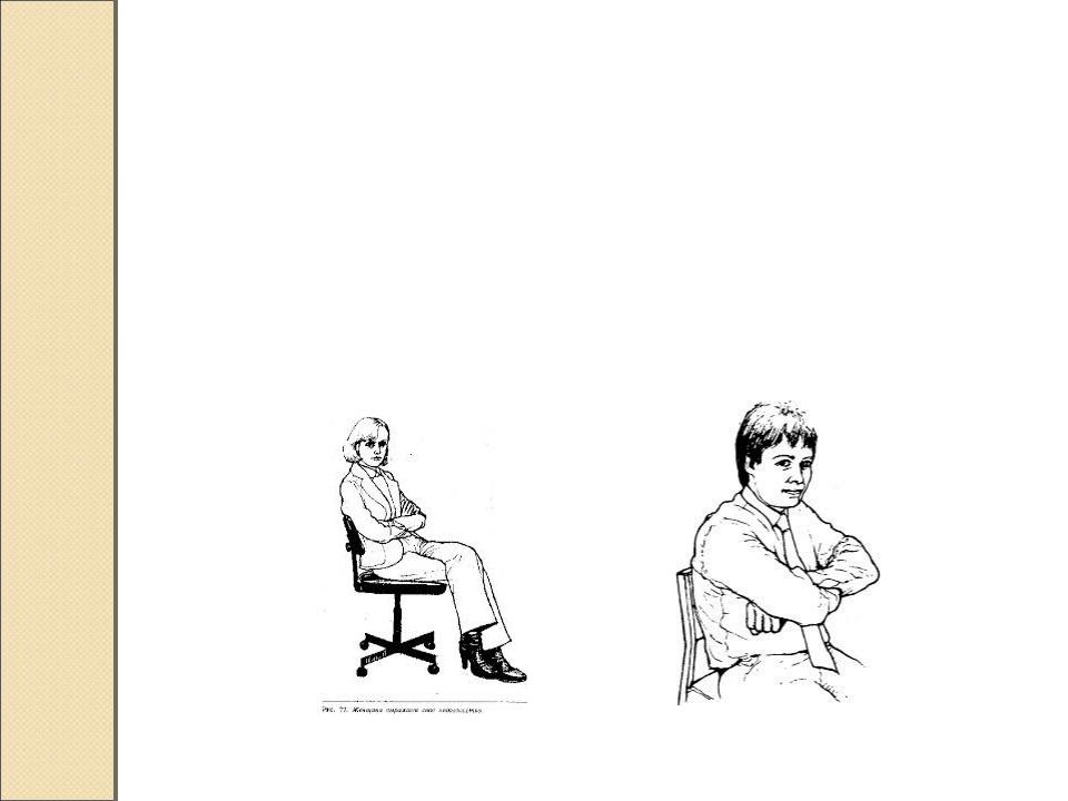 Закрытая поза: скрещенные ноги или руки обычно отражают защитную реакцию и нежелание общаться, Быстрый, резкий наклон или поворот головы, жестикуляция указывают на то, что пациент хочет высказаться.