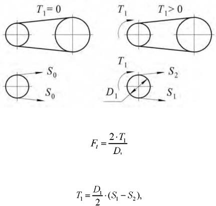 При передаче крутящего момента Т1 усилия в ветвях ременной передачи изменяются. На рисунке 4.2 показаны усилия в ветвях ремня в двух случаях: без нагрузки T1 = 0 и под нагрузкой T1 > 0.
