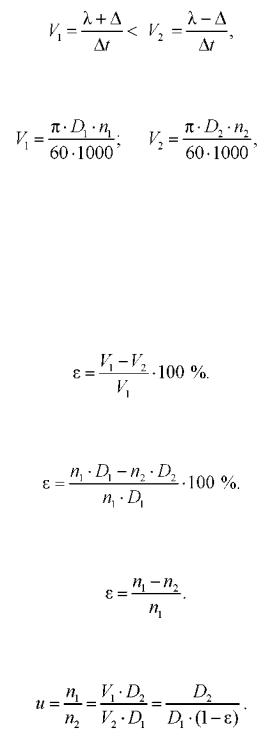 V1 и V2 - окружные скорости ведущего и ведомого шкивов соответственно,
