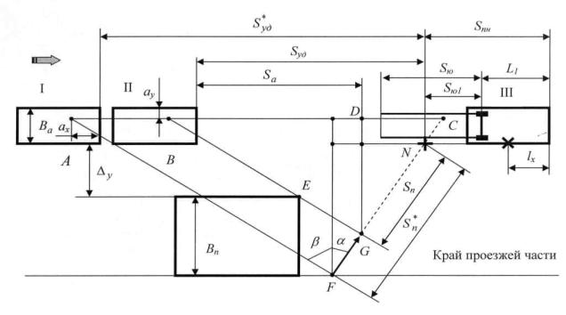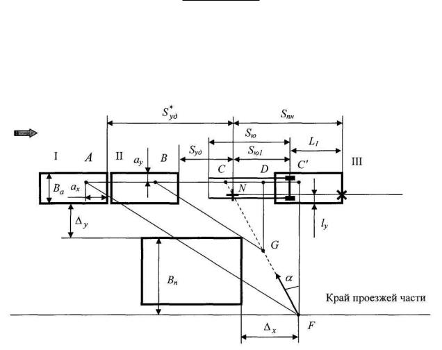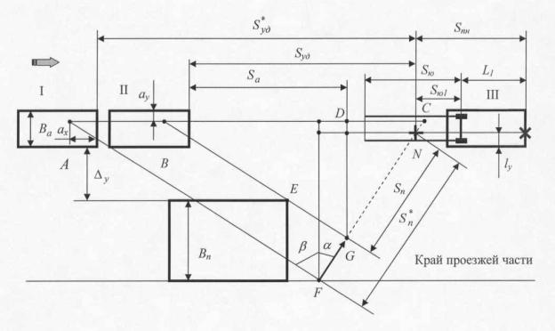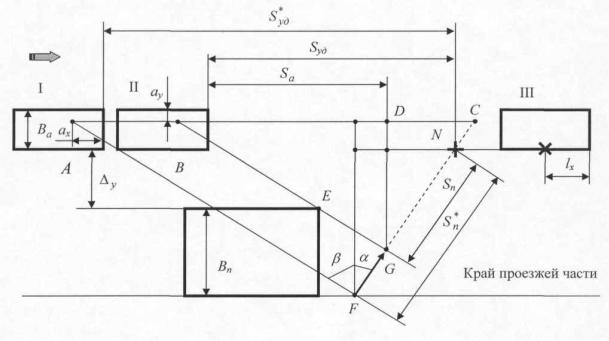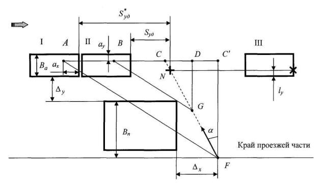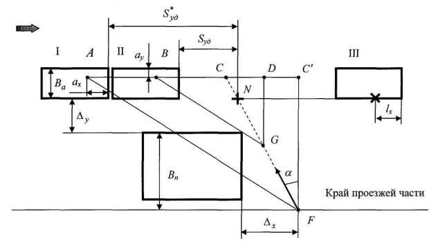 Рассмотрим теперь случай наезда на пешехода торцевой частью автомобиля, когда пешеход вышел на проезжую часть на некотором расстояниих из-за неподвижного препятствия под произвольным углом во встречном движению автомобиля направлении (рис. 9). Дополнительным построением покажем предполагаемое положение автомобиля в момент появления пешехода на проезжей части (позиция I), в момент появления пешехода в зоне видимости водителя автомобиля (позиция II), и после наезда (позиция III).