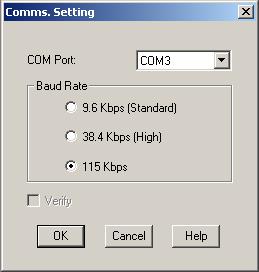 Перед загрузкой проекта в память сенсорного монитора компиляции проекта не требуется и программой NT-series Support Tool эта процедура не предусматривается. Поэтому перед загрузкой необходимо непосредственно настроить параметры связи с сенсорным монитором. Для этого в меню Connect нужно выбрать пункт Comms. Setting, при этом появляется окно настройки параметров связи (рис. 12). В окне параметров связи необходимо выбрать COM2, 115 Kbps и для подтверждения этого нажать ОК.