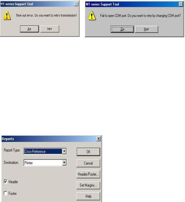 При неправильном подключении или параметрах связи на экране ПЭВМ появится окно с сообщением об ошибке (рис. 15, а), в котором предлагается повторить попытку связи или отказаться от этой операции. В том случае, когда номер СОМпорта ПЭВМ, выбранного в настройках не соответствует действительному соединению СМ и ПЭВМ на экране монитора появится окно (рис. 15, б), в котором будет предложено сменить номер СОМ-порта.