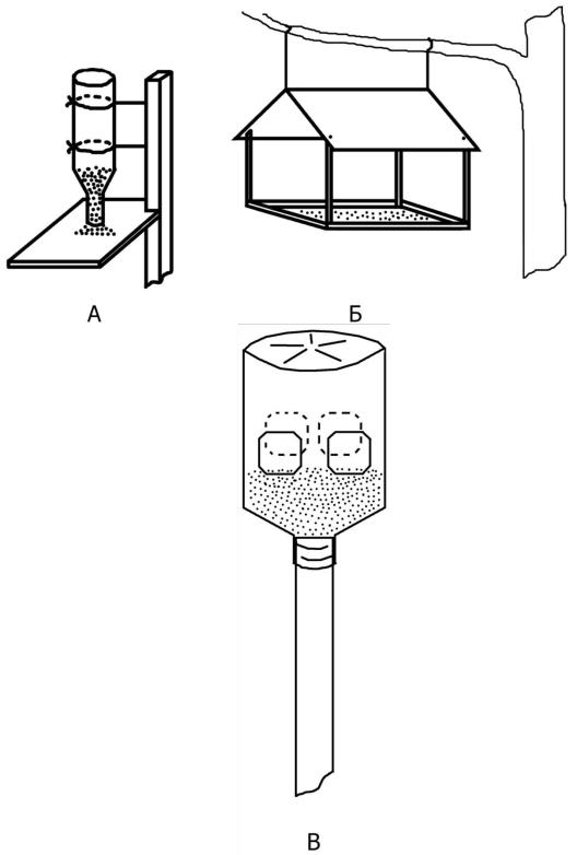 Разновидности кормушек для птиц: А – автоматическая кормушка-бутылка, Б – кормушка-домик, В – кормушка-бутыль.