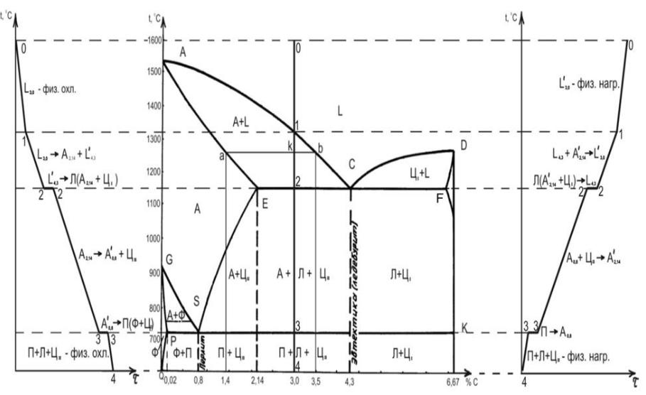 Рис. 2. Диаграмма железо-углерод, кривые охлаждения сплава, содержащего 3 % C