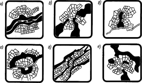 Рис. 9. Классификация городских систем озелененных пространств по доминирующему компоненту: а — водно-зеленый диаметр; б — зеленые клинья; в — центральное зеленое ядро; г — поясная (кольцевая, полукольцевая система); д — ряд зеленых полос; е — без выраженной доминанты или комбинированные.