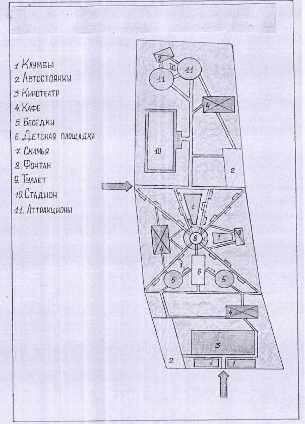 ипринцип взаимного расположения его функциональных зон. Нельзя забывать о том, что масштаб схемы не позволяет детальной проработки каждой зоны, поэтому лучше оперировать открытыми и закрытыми пространствами для формирования зон парка и задавать основные пешеходные оси без указаний на отдельные элементы (скамьи, деревья, архитектура, аттракционы). Зная форму территории городского парка, на схеме озеленения города студент увеличивает парк в 2-3 раз, сохраняя его форму, и переносит его на лист и начинает рассчитывать площади основных функциональных зон парков, в дальнейшем добавляя малые архитектурные формы и элементы парка.