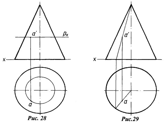 разующую конуса, находят положение этой образующей на фронтальной проекции и определяют положение фронтальной проекции точки а/ (рис. 29). На рис. 28, 29 показаны только видимые точки.