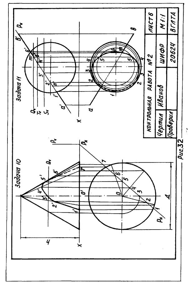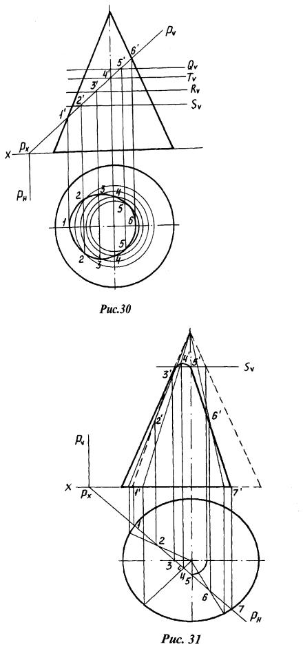 3.3. Точка 4 определяет наивысшую точку гиперболы и находится на образующей конуса, перпендикулярной к горизонтальному следу плоскости Рн. Фронтальные проекции промежуточных точек находят как показано на рис. 28, 29.