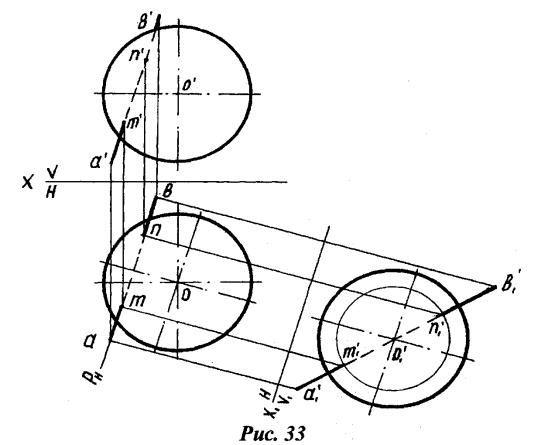 4. Решение этой же задачи можно упростить, если применить способ перемены плоскостей проекций. На рис. 33 показано нахождение точек пересечения прямой АВ с поверхностью сферы.