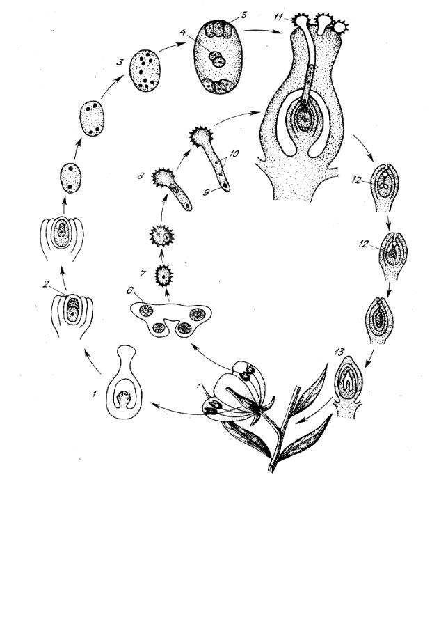 1. Пестик с семяпочкой (после мейотического деления); 2. тетрада мегаспор; 3. образование зародышевого мешка в итоге трех последовательных митотических делений нижней мегаспоры; 4. два полярных ядра в центре зародышевого мешка; 5. яйцеклетка с двумя синергидами (спутниками); 6. поперечный разрез пыльника с гнездами археспориальной ткани/ из каждой клетки которого образуется тетрада микроспор; 7. пыльца (микроспора) и первое еѐ деление; 8. проросшая пыльца с вегетативной и антеридиальной клетками; 9. вегетативное ядро; 10. два спермия; 11. пыльцевая трубка проросшей пыльцы в тканях пестика, достигшая20 зародышевого мешка семяпочки; 12. процесс созревания зародыша; 13. семя с созревшим зародышем.