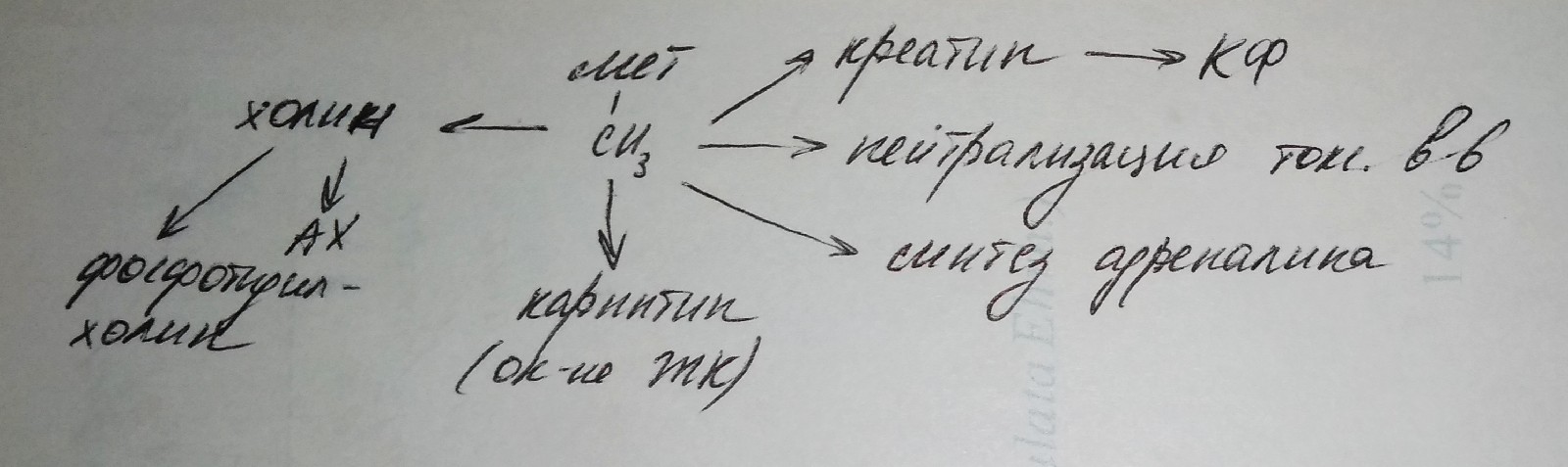 После отщепления метильных групп метионин превращается в гомоцистеин, на который переносится СН3-гр.При помощи фолата и В12, донором является серин